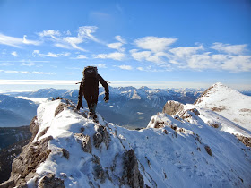 Bald stehen wir auch schon am 2.106 Meter hohen Riffel und können erstmals den gesamten Riffelgrat einsehen, über den wir heute den Kreuzkogel erreichen wollen. Vom Gipfel aus können wir die Situation aber nicht ausreichend einschätzen, also entscheiden wir uns erstmal ein paar Meter Richtung Grat abzusteigen. Die Seile teilweise unter dem Schnee- dennoch ganz gut machbar.