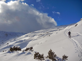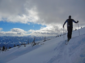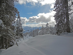 Wir queren nach der Alm links in den Wald und steigen in steilen Spitzkehren durch die winterliche Landschaft höher. Matthias leidet heute unter einem Bindungs-Placebo-Effekt, doch das gute Stück erweist gute Dienste und so lassen wir auch seine Schicksalsstelle ohne Zwischenfall hinter uns.