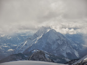 Mit kurzen Fell-Abfahrten im Gepäck steigen wir schließlich in der guten Spur den Gipfelhang empor. Die Lawinengefahr hält sich bei dieser Tour in Grenzen, und erfreut sich deswegen auch den ganzen Winter über großer Beliebtheit. Wir begegnen aber heute nur wenigen Menschen, sicherlich auch wegen der unsicheren Schneelage, dir wir aber heute gekonnt für uns nutzen! Schließlich ist der höchste Punkt erreicht und mein entgeistertes Gesicht trifft auf eine fragende Mimik von Matthias: Es ist windstill! Das Ausbleiben des prognostizierten Föhnwindes lässt aber auch leider die Wolken nur bedingt verschwinden, so macht sich die kalte Temperatur schnell bemerkbar. Neidisch blicken wir aufs Warscheneck (2.388m), das heute den Hauptgewinn gezogen hat.