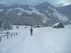 | Auf leicht angezuckertem Untergrund geht es auf der Forststraße zur Hintersteiner-Alm |
