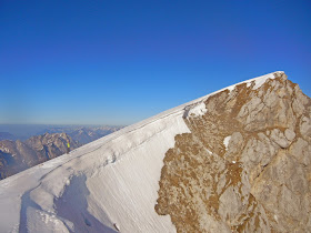 Überraschend schnell erreichen wir den kurzen Grat zum 2.027m hohen Hauptgipfel. Hier haben sich riesige Wechten gebildet und Vorsicht ist geboten. Auch Skispuren sind hier heroben auszumachen- die Verhältnisse aber doch recht bescheiden, denn auch die nördlichen Passagen warten mit sehr wenig Schnee auf.