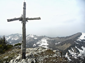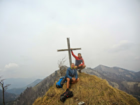 Vom Ennsberg geht es am Kamm und durch herrliche Waldabschnitte dem Hühnerkogel entgegen. Die Aussicht wäre hier wahrscheinlich schon formidabel, aber wir geben uns mit einer Konditionstour um unsere Fitness zu testen, ebenso zufrieden. Wenn man nicht zu viel erwartet, wird man schließlich auch nicht enttäuscht. Nach etwas mehr als 2 Stunden erreichen wir den Gipfel des Hühnerkogels und rasten zum ersten Mal um unseren weiteren "Leidens"weg unter die Lupe zu nehmen. Der gegenüberliegende Almkogel, den ich vor wenigen Wochen als Sonnenuntergangsberg auserchoren habe, ist unser nächstes Ziel- und auch leider das Einzige, das wirklich klar ersichtlich ist. Nun geht es in wenigen Minuten an den 250 Höhenmeter umfassenden Abstieg um beim Übergang auf 1.216m den prominentesten Gipfel des Reichraminger Hintergebirges in Angriff zu nehmen.