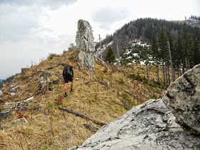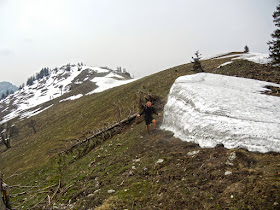 Vom Ochsenkogel muss man nun wieder etwas weiter absteigen um über das Reiflingeck den teils sehr steilen Wiederanstieg zum Waldgipfel des Hochzöbels zu beginnen. Der Weg, der durch umgefallene Bäume erschwert wird, bleibt aber durchgehend interessant und wir sind weiterhin erfreut, dass sich nicht einmal der Ansatz von einem "Winter-Comeback" abzeichnet.
