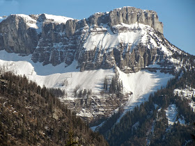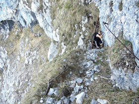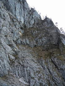 Wir steigen also um 09.45 Uhr in den fast zur Gänze aperen Steig ein und genießen die Einsamkeit auf neuem Terrain. Die alten Versicherungen, oder besser die, die noch vorhanden sind, halten noch gut und so erreichen wir bald die "Schlüsselstelle" vor dem Überstieg, die in leichter Kletterei überwunden wird, eher wir mit einem Bad in der Frühlings-Sonne belohnt werden.