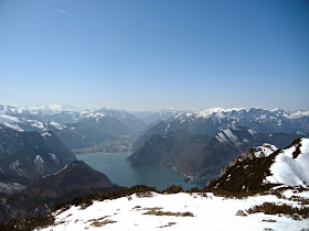 Wir halten uns nicht lange auf und marschieren übers verschneite Plateau. Der Schnee trägt heute aber besonders gut und so haben wir auch mit den "Patscherln" absolut kein Problem. Das Kreuz rückt näher und mit ein bisschen Wehmut, dass der "Stoan" jetzt wieder zur Touristenzone avancieren wird, blicken wir zum Großen Priel, der sich mit seinem weißen Haupte noch keine Gedanken über einen Ansturm machen muss. Vom Gipfel folgen die klassichen Ausblicke Richtung Ebensee und Gmunden und auch der Traunsee glänzt mit seinem eisigen Wasser verführerisch in der heißen Mittagssonne.