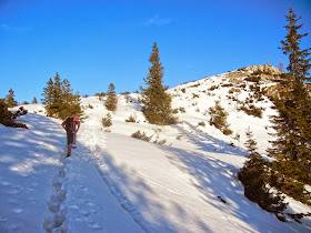 Völlig schneefrei geht es bis auf etwa 1.150 Meter, wo sich der Winter beschämt zurückmeldet und mit den letzten Resten gegen den Frühling kämpft. Doch die Last-Man-Standing Attitüde bringt nicht mehr viel und so verliert sich das weiße Gold schnell wieder.