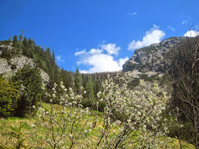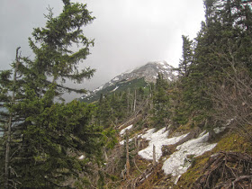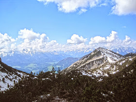 Wir folgen hier aber nicht mehr dem Normalweg, sondern wenden uns nach links einem kaum erkennbaren und spärlich mit Steinmännern markiertem Pfad zu. Dieser bringt uns vorerst über Geröll, später durch Latschen hindurch zu einem felsdurchsetzten Hang, der uns steil, aber sehr schnell direkt zum großen Kreuz bringen sollte. Wir freuen uns über eine neue "Nock-Variante" und blicken zufrieden und mit trockenem Schuhwerk zum noch hübsch eingeschneiten oberen Abschnitt des Budergrabensteigs.