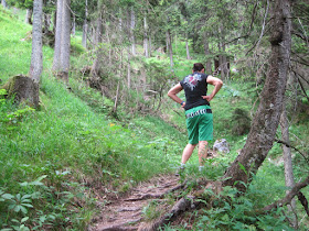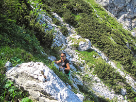 Beim Brünndl zweigen wir also links ab und marschieren vorerst über steile Forststraßen, dann über einen gut ausgetretenen Pfad der Bischofsmütze entgegen, die "Siegi" heute auch in ihre bisher spärliche Gipfelsammlung aufnehmen darf. Konditionell hält meine Mutter gut mit, obwohl sie nach eigenen Angaben natürlich überhaupt nicht fit ist. Doch wer im April noch einen Halbmarathon gelaufen ist, hat bei Ausreden schlechte Karten. Der "Schecki" ist ob des heutigen Fronleichnamstags auch nicht mit Einsamkeit gesegnet und so kürze ich, unter lautstarken Protesten, einige Passagen gekonnt ab. Schon stehen wir bei den ersten leichten Kletterstellen, die man noch leicht umgehen kann. Doch weil ich meinen sportlichen Ehrgeiz nicht von irgendwo habe, wählt auch Siegrid die direkte Linie.