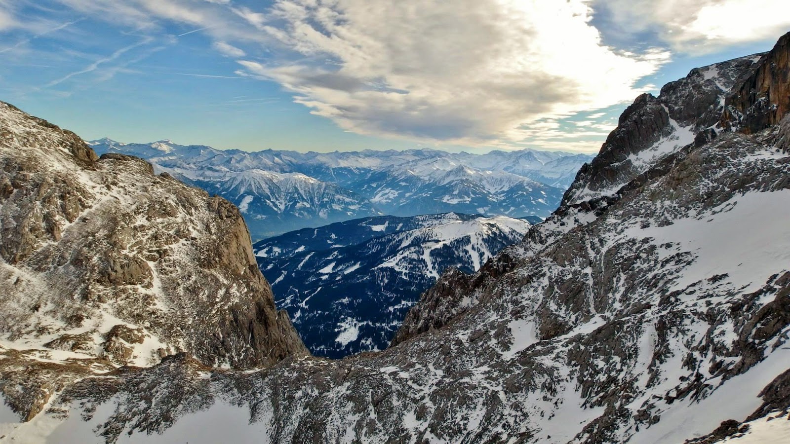 Die Aussicht ist heute fantastisch. Wir haben mit einem Samstag am Hochkönig richtig spekuliert. Stubaier, Karwendel, Ötztaler, Totes Gebirge, Tauernriesen (Ich könnt das noch ein wenig fortführen, aber das ist dann doch eher monoton) Jedenfalls kann ich den weiteren Wegverlauf so beschreiben, wie es Stieb und Pichler bei einigen Routen auf den Traunstein tun: "Es geht aufwärts". Das nahende Matrashaus immer im Blickfeld.