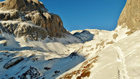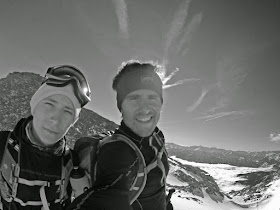 In unseren Spuren kommen wir sehr sehr flott voran und stehen nach 1h50min wieder bei unserem gestrigen Umkehrpunkt. Nun geht es recht beschwerlich und oft tief einsinkend in das Kar nebst der formschönen Gestalt der Torsäule. Wir nutzen jeden herauslugenden Stein (und davon gibt es sehr viele) um das Tempo zu beschleunigen. Oberhalb sehen wir plötzlich zwei Tourengeher. "Wann sind denn die bitte gestartet?" fragt Moritz ungläubig. Und er sollte mit seinen Zweifeln Recht behalten. Auf knapp 2550 Metern überholen wir die beiden Biwakierer von gestern Abend, die sich mit Ski und Schneeschuhen am Rücken sichtlich schwer tun. Nach einem recht netten Gespräch entscheiden sich die Niederösterreicher aus Zeitgründen zur Umkehr und dürften bei der Abfahrt noch recht brauchbare Verhältnisse gehabt haben.
