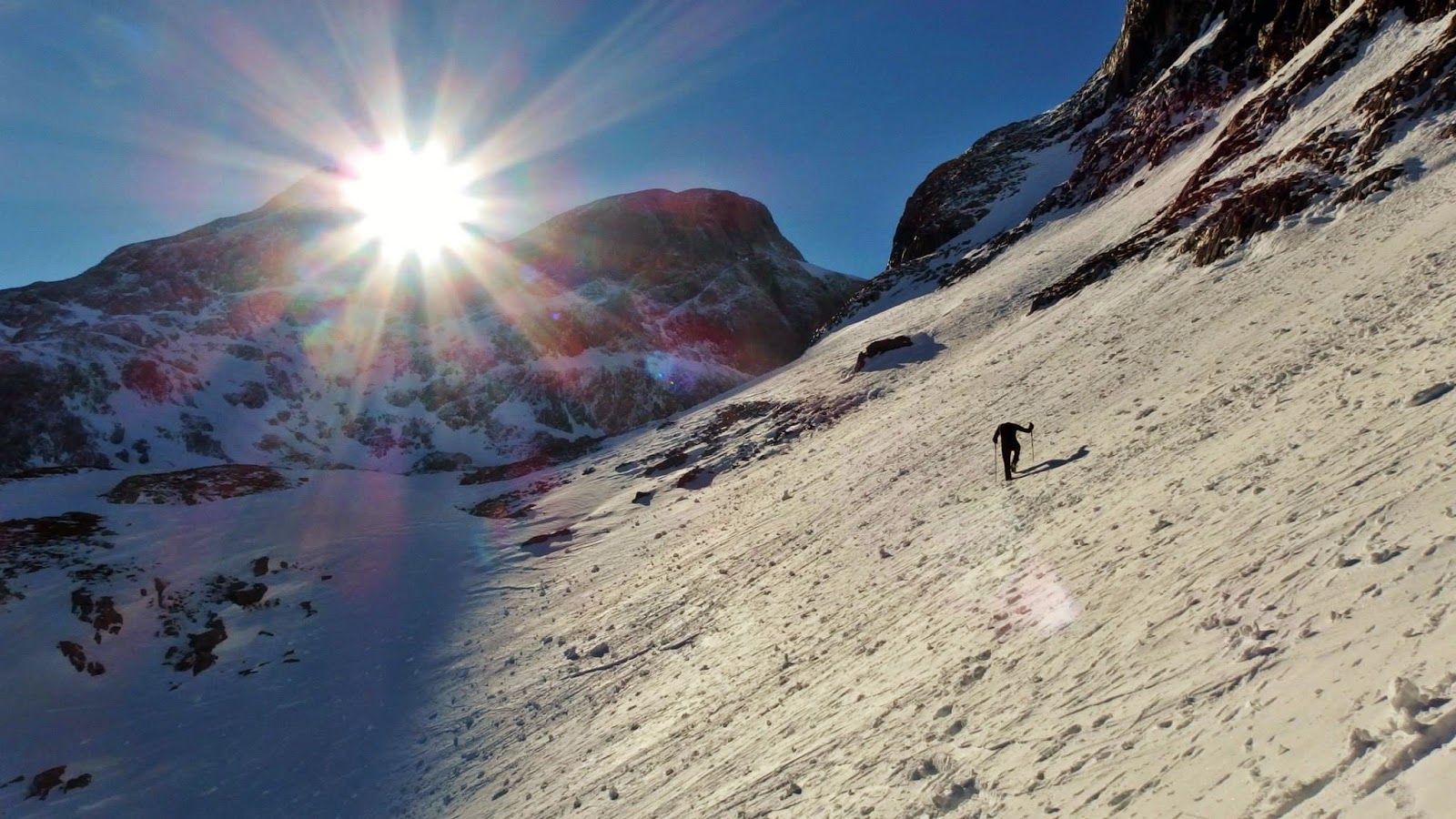 Auf etwa 2400 Metern, um 16:15 Uhr, beschließen wir umzudrehen, um wie dem Wirten versprochen, vor Einbruch der Dunkelheit zurück zu sein. Im Abstieg begegnen wir schließlich zwei Tourengehern, in voller Montur und zusätzlich mit Schneeschuhen ausgestattet. Die Beiden wollen noch heute den Gipfel erreichen um am Matrashaus zu nächtigen. Falls ihnen die Kraft, beziehungsweise Lust, ausgehen sollte, wollen sie biwakieren.