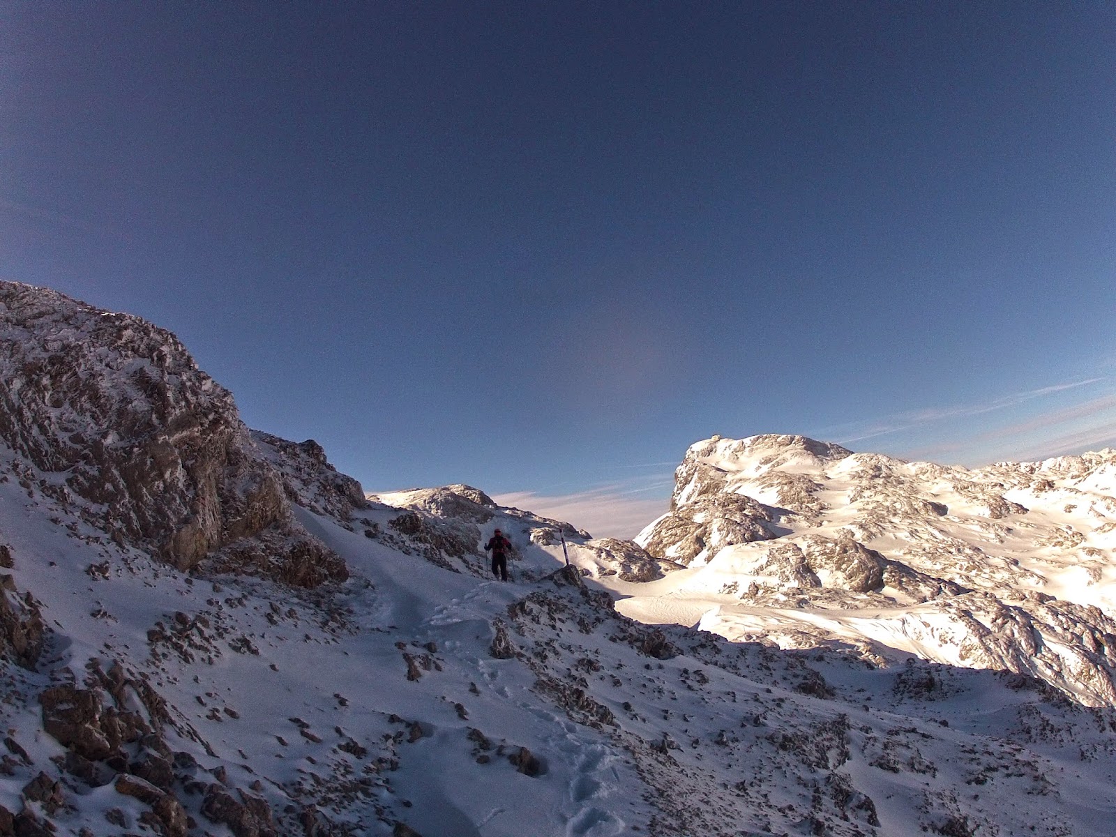 Ab hier stoßen wir auf sehr brauchbare Verhältnisse undd sind mit unseren Bergschuhen klar im Vorteil. Es präsentiert sich bald ein völlig abgewehtes Plateau, auf dem es mit Ski oder Schneeschuhen doch recht unangenehm wäre. Natürlich- es gibt sie noch, die traumhaften Ausflüge unter die Schneedecke, die von mehr oder weniger bösartigen Flüchen begleitet werden.