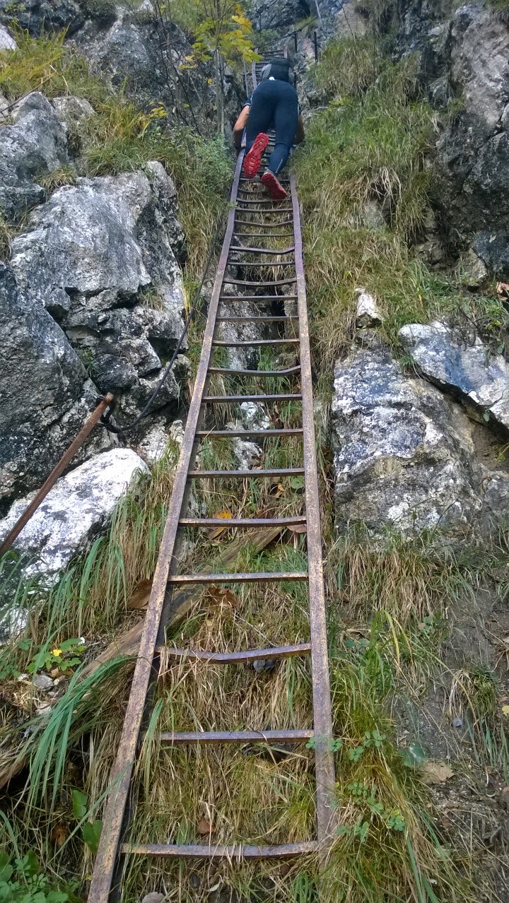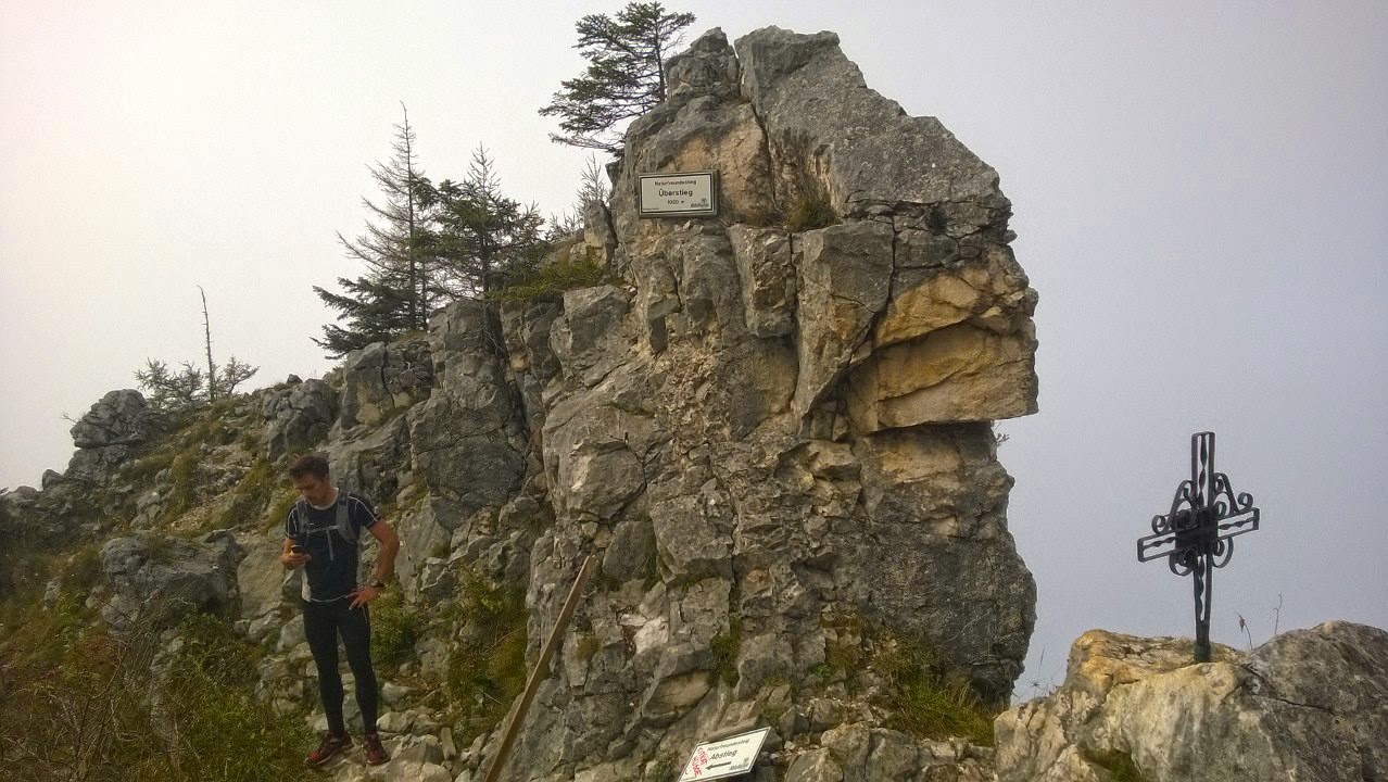 Dem wunderbaren Weg folgt man anhand der alten Markierungen bis zu einem kleinen Wandl. Dieses Wandl kann man als "Schlüsselstelle" des Steigs bezeichnen. Eine Leiter wurde entfernt und somit zauberte man daraus "unabsichtlich" eine ganz kurze feine Kletterstelle im oberen zweiten Schwierigkeitsgrad. Die Stahlstifte der alten Leiter erleichtern den Aufschwung und man ist auf 1.020m angekommen, dem sogenannten Überstieg. Hier befindet man sich man wieder am markierten (neuen) Naturfreundesteig. Wir aber steigen wieder ab bis kurz vor die Tafel, die mit "Am Südwestgrat" (970m) angeschrieben ist. Hier beginnt der obere Südwestgrat, den man sich vorerst einmal suchen muss.