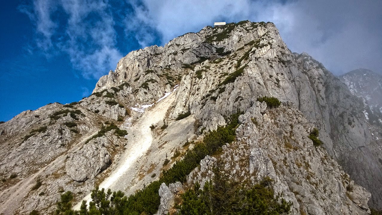 Man bleibt solange am Grat bis es dank Latschen und (zu) schwierigen Kletterpassagen unmöglich wird und verlässt ihn nach links in die breite Schotterrinne. Diese quälen wir uns in Folge etwa 150 Höhenmeter bergan, wobei Hans sein Schimpfwortrepertoire um einige Ausdrücke erweitert. Nun wird die Rinne schmaler und es geht in leichter Kletterei aufwärts. Am oberen Ende wenden wir uns nach rechts und nähern uns über eine kurze Steilstelle (I-II) dem Ausstieg nebst der Naturfreundehütte.