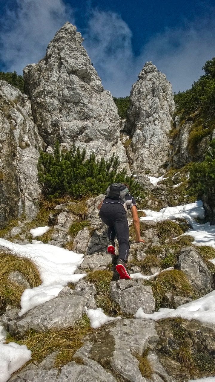 Kurz über Grasflanken und Geäst wendet man sich den ersten Felsen zu, die man am Besten auch nicht mehr verlässt. Direkt am "Grat" warten wunderbare Kletterstellen im II. Schwierigkeitsgrad darauf überwunden zu werden. Den Weg kann man hier eigentlich nicht mehr verfehlen und an der rechten Begrenzung der wohlklingenden "Scheißheislrinne" geht es über herrlichen kompakten Fels aufwärts.