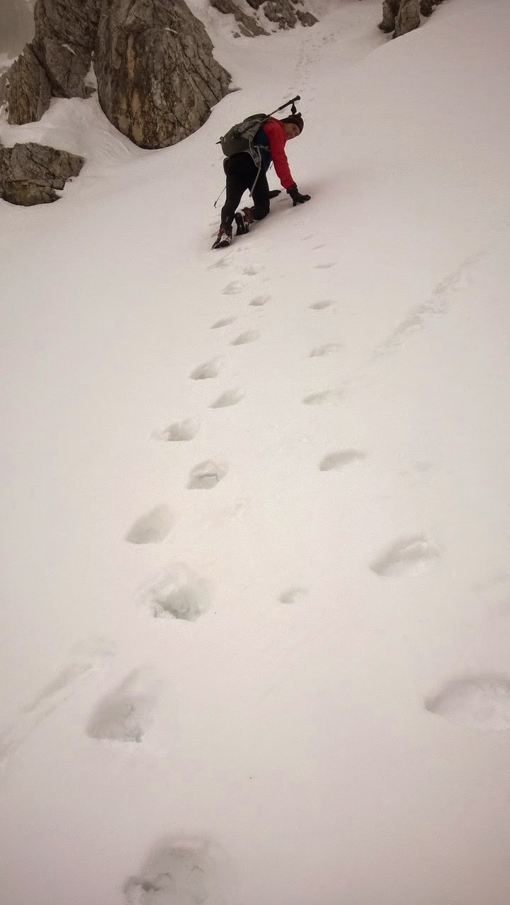 Wir kommen ohne "Feindkontakt" schnell aufwärts und erreichen das Prielschutzhaus, wo wir unsere mitgebrachten Stöcke (die Geheimwaffe des Winterbegehers) aus ihren Verstecken holen um für den folgenen Kampf gegen die Stiefkinder von Frau Holle gewappnet zu sein. Die Blicke zur Spitzmauer sind zwar wie immer wunderschön, doch der Anblick des Brotfalls lässt uns keine großen Freudensprünge machen. Eine dicke, tiefliegende Wolkenschicht hat den Gipfel des Priels fest im Griff und sieht auch nicht so aus, als würde sie heute noch den "Besitzer" wechseln. Naja, wir haben sowieso keine Wahl. Kurz vor der Abzweigung in die Klinserschlucht beginnt dann die durchgehende Schneedecke, die aber anfangs noch gut trägt und das Weiterkommen nicht zu einer Sisyphos-Arbeit macht. Noch nicht.