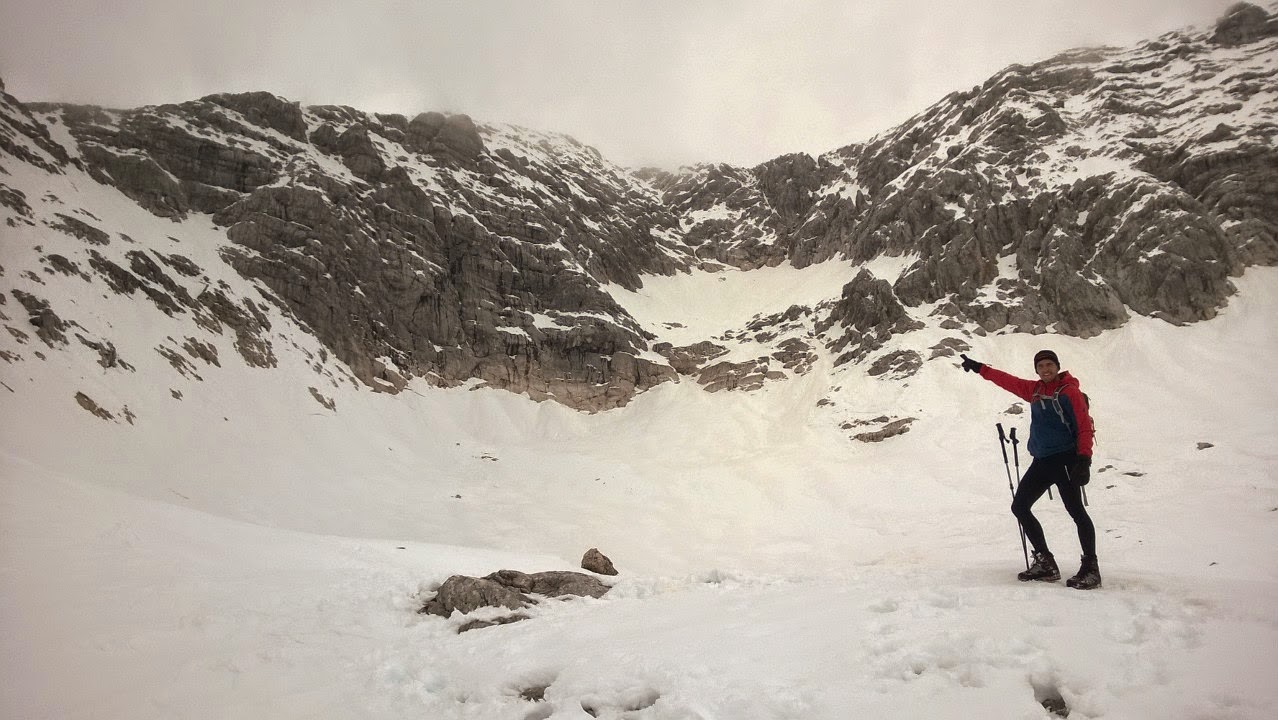Die Kälte, die langsam in unsere völlig durchnässten Schuhe kriecht, treibt uns wieder zurück in die Wärme des Prielschutzhauses. Über denselben Weg, diesmal bedeutend schneller, geht es wieder zurück über die Brotfallscharte ins Kühkar. Ab hier hätte es auch dem Schlitzohr der griechischen Mythologie Sisyphos gefallen: Ein Schritt talwärts, zwei Schritte unter die Schneedecke. Trotz des Gefühls auch Barfuß gehen zu können, macht es Spaß und wir erreichen vergnügt den Winterraum des Prielschutzhauses, wo wir uns bei Bier und Radler aufwärmen.
