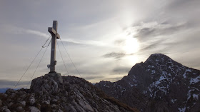 Gleich nach diesem schönen Aufschwung folgen die einzigen nennenswerten Kletterstellen. Im II. Schwierigkeitsgrad geht es über kompakten Fels, für den die Haller Mauern nicht unbedingt bekannt sind, abwechslungsreich aber leider sehr kurz aufwärts. Nun offenbart sich der Blick zum Kreuz des Großen Pyhrgas, das mit Rauhreif überzogen auf uns herablacht. Eine lange Querung in den abschüssigen Wiesen des Ostgrats später, können wir auch die letzten Meter in teils vereistem Gelände absolvieren. Mein Stirnband verabschiedet sich dabei in die Nordabstürze des Großen Pyhrgas. Weil ich den Wert meines Lebens, hochnäsig und selbstüberheblich wie ich bin, auf mehr als 12 Euro einschätze, verzichte ich auf ein längeres Abklettern und überlasse meinen geliebten Ohrschutz dem Haller-Mauern König. "Ganz wie früher", denke ich. Da hat man den Königshof auch nur mit milden Gaben im Gepäck betreten dürfen. Der traumhafte Blick zum Grimming und die untergehende Sonne reißt mich aber schnell wieder aus der Vergangenheit und lässt mich das tun, was wir Bergsteiger am Liebsten tun: Den Augenblick genießen.