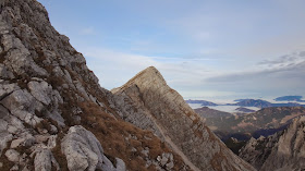 | Rückblick vom Grat aus. An der Schlüsselstelle klettert man kurz in die Südseite ab |