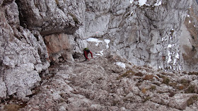 Die Scharte ist wiederum flott erreicht und bei aufkommendem Wind und sinkenden Temperaturen nehmen wir uns den Ostgrat auf den Großen Pyhrgas vor. Hier muss man sich mit einem kurzen Quergang und einer anschließenden Rampe in der Nordseite anfreunden. Einige Schelme haben diese Stelle mit Punkten und Pfeilen markiert, sodass zwar der Weg auch für jeden Einfallspinsel zu finden ist, aber der alpine Flair ein Stück weit verloren geht. Steinmänner und Trittspuren in ausreichendem Umfang machen ein Verirren ohnehin schon schwieriger. Vor dieser Stelle hatten wir bei unseren Überlegungen noch die größte Ehrfurcht, hatten wir doch mit Schnee und Eis gerechnet. Ein kurzer vereister Quergang und ein paar Schneefelder am Anfang der Rampe lassen uns aber schnell durchatmen und so kann ich auch mit meinen Laufschuhen den weiteren Anstieg genießen.
