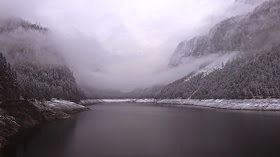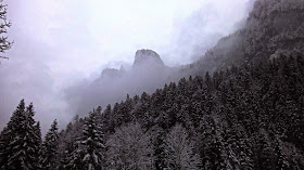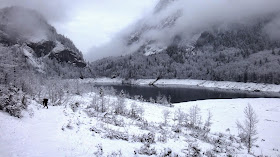Wir sind uns einig,dass eine Besteigung des Dachsteins heute definitiv drin wär und entscheiden uns dennoch dagegen. Hans äußert Zweifel an den zeitlichen Möglichkeiten die Tour noch durchzuziehen und schließlich lasse auch ich mich bändigen und wir verweilen noch ein wenig inmitten dieser unwirtlichen aber wunderbaren Natur und können sogar noch die Gruppe Ungarn begrüßen, die wir erst kurz vor tatsächlichem Eintreffen aus dem Nebel schreiten sehen. Während sich die Gruppe für eine weitere Nacht auf der Hütte vorbereitet steigen wir bei dichtem Schneetreiben wieder zurück zum Gosausee ab.