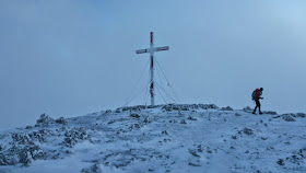 Unterhalb des pulvrigen Neuschnees befindet sich eine nennenswerte Eisschicht und so landen wir in abwechselnder Reihenfolge auf dem Allerwertesten. Doch angesichts der beinahe mystischen Stimmungen kann uns nichts so schnell die Laune verderben und wir passieren auch bald den Lagelsberg. Selbst Michael, der sich nur sporadisch dem Bergsport widmet, ist heute in Topform und bald können wir das "Matrosen-Kreuz" des Warschenecks erkennen.