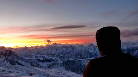 Etwa zehn Minuten verweilen wir in Eiseskälte und beobachten wie die Natur sich künstlerisch betätigt. Immer mehr werden die Nebelschwaden in rotes Licht getaucht und plötzlich können wir auf der gegenüberliegenden Kremsmauer ein Licht am Gipfel erkennen. Durch die heutige Wintersonnenwende werden auf vielen Bergspitzen Feuer entzunden und der kürzteste Tag des Jahres verabschiedet.