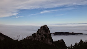 Von St.Wolfgang geht die Reise durchs Weißenbachtal zum Taferlklausee, wo bei wirklich zapfigen Temperaturen im dicken Nebel der Aufstieg auf den Brunnkogel begonnen wird. Wir spielen trotz unserer Laufbekleidung mit dem Gedanken in den Nordwestgrat einzusteigen, verschieben die Entscheidung aber über den Nebel um die Verhältnisse abzuwarten. Die Stimmungen, die sich knapp über der Nebelgrenze ergeben sind fantastisch und so können wir auch den Franz Scheckenberger Steig (II-) schnell hinter uns lassen. Der bröseltrockene Fels nimmt uns dann schließlich die Entscheidung ab und wir klettern behutsam über den Nordwestgrat (III+) auf den Brunnkogel. Am Gipfel angekommen bin ich von den wunderbaren herbstlichen Farbtönen überwältigt. So oft war ich schon auf diesem wunderbaren Aussichtsgipfel, heute umschwebt die Erhebung aber eine ganz besondere Atmosphäre. Diese lassen wir gut zehn Minuten auf uns wirken, bevor wir über den guten alten "Schecki" wieder in den Frost zurückkehren.
