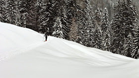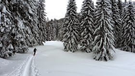 Auch im Wald sind die Schneeverhältnisse noch sehr gut und unsere Freude reißt erst ab, als wir die Skier beim 50 Höhenmeter- Gegenanstieg abschnallen und bergwärts stapfen. Die restliche Abfahrt über die Forststraße dann mehr monoton als spaßig und schon stehen wir wieder bei unserem Ausgangspunkt. Für die heutigen Verhältnisse haben wir eine absolut brauchbare Tour absolviert und sind uns einig, dass die Wiederholung von