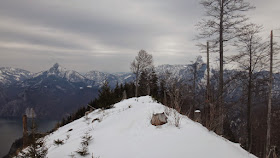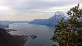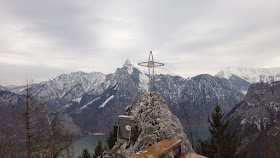 Ich laufe also an der Pfarrkirche Ebensee vorbei, bringe eine lästig-steile Asphaltsteigung hinter mich und steige flugs in den Wanderweg ein. Die Kirche wird immer kleiner und ich fühle mich wie ein Adler, der über seinem Nest kreist. Der Weg ist unschwierig und völlig aper und so kann ich den "Stopp-Button" meiner