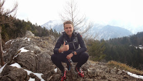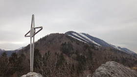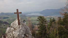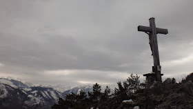 Das Wetter zeigt sich als angenehmer, lauwarmer Laufkumpane, nur ab und zu beweist der aufkommende zischende Nordwind, dass der Kampf der Jahreszeiten mitten in seiner erbitterten Endphase angelangt ist. Ich halte mich nicht lange auf und laufe, nach einem Schluck aus der isotonischen Pulle, kurz den Normalweg bergab, bevor ich mich nach rechts zum Einstieg in die "Sonnsteinüberschreitung" wende. Hier zwingt ein kurzes vereistes, aber seilversichertes Steilstück, nocheinmal zu erhöhter Vorsicht und dann kann ich es schon laufen lassen. Wenige positive Höhenmeter trennen mich noch von eine rasanten "Abfahrt" durch die aufsteilende, gespurte Schneedecke. Nach einer guten 3/4- Stunde, seit ich den ÖBB den Rücken zugekehrt habe, stehe ich am Sattel zwischen Großem und Kleinem Sonnstein. Ab hier ist auch wieder alles aper und bald habe ich mit stetigem Blick zum Schattenspender, den erschüttert blickenden Jesus am Kreuz des 923m hohen Aussichtsgipfel erreicht.