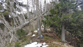 Bevor man den tatsächlichen Gipfel erreicht, müssen noch einige Höhenmeter abgestiegen werden. Und da entdecke ich doch tatsächlich Skispuren, die von der Hochsteinalm heraufführen. Doch die falsche Jahreszeit fürs Laufen? Und im Wald wird es dann erst richtig winterlich.