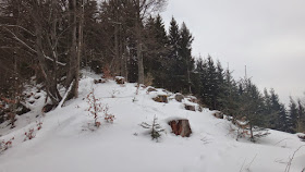 War bis hierher die Wegfindung nicht sonderlich anspruchsvoll, wird es nun interessanter. Von der Geisswand führt ein gut ausgetretener Steig auf den Bergrücken, auf dem sich eine Tafel mit der Aufschrift "Zur Forststraße" befindet. Leicht steigend folgt man dem Rücken, bis die Forststraße, die zur Hochsteinalm führt, betreten wird. Hier ist es nun wichtig stur geradeaus weiterzumarschieren und die Reize der angenehmen Forststraße zu ignorieren. Ehe man sich versieht, steht man schon mitten im gemüsigen Steig zum 1.239 Meter hohen Farnaugupf, der heute alles andere als ein abenteuerliches Vergnügen ist. Der Lauf entwickelt sich schnell zu einer ausgelassenen Stapffete, zu der ich lieber nicht eingeladen worden wäre. Gäste wie Harsch, tiefer Pulverschnee und tückischer Windwurf versetzen einen auch nicht unbedingt in Feierlaune. Und so stapfe ich hoch über dem Traunsee, erst im Wald,später auf breitem Grat Richtung Gipfel.