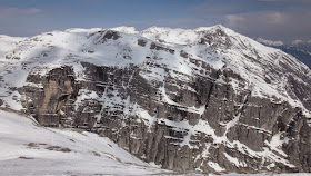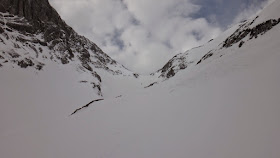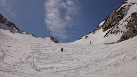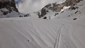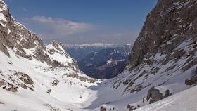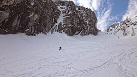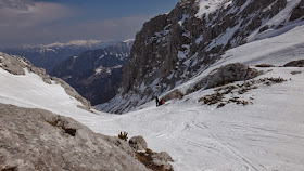 Die Abfahrt ist nur mehr im oberen Bereich ein Genuss und schon die etwa 40 Grad steile Stufe wird im langsam beginnenden Sulz gefahren. Die Abfahrt nebst der eindrucksvollen Wand des Gamsspitz macht dennoch ordentlich Spaß und schnell erreichen wir wieder die Steilstufen im unteren Bereich.