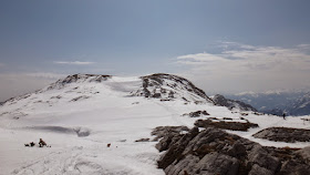 Viele beenden die wunderbare, aber lange Skitour hier und geben sich gipfellos zufrieden. Obwohl uns auch in westlicher Richtung der Große Tragl mit seinen wunderschönen Karstformationen lockt, bleiben wir dem Plan treu und absolvieren weitere 200 Höhenmeter in flacherem Gelände um auf den Großen Brieglersberg zu gelangen.