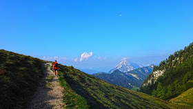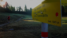 Wir laufen heute nicht auf Zeit, sondern können die Umgebung beobachten, wie sie aus ihrem allnächtlichen Dornröschenschlaf erwacht. Das Profil gräbt sich ins sumpfige Gelände, das Wasser spritzt auf die strapazierten Waden und das Lächeln im Gesicht ist fast zu beneiden. Der Weg ist gut markiert und wir erreichen die Leistalmhütte, wo wir uns ohne große Pause Richtung Interhüttenalm aufmachen. Almen, wohin das Auge reicht! Immer wieder unterbrechen Single-Trails die sanften Wiesenwege und sorgen für Glück im Glück.