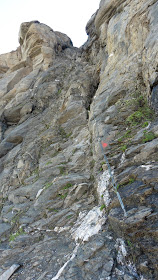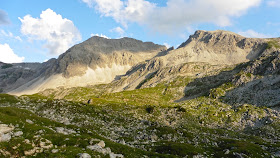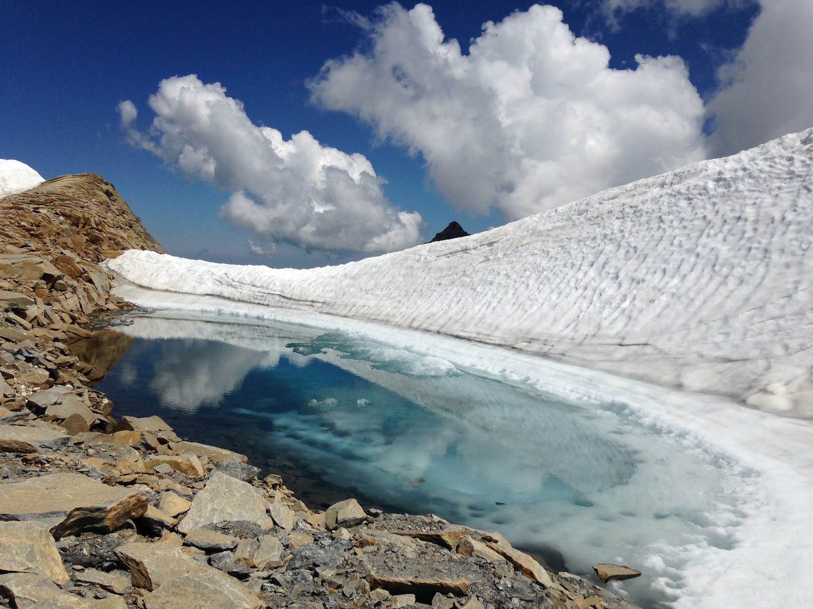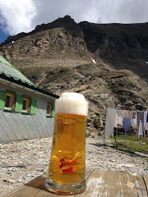 Vor der Kälte schützt mich auch nicht das Reptil mit Vorliebe für die italienische Küche und so müssen wir uns langsam wieder nach unten bewegen. Hans übernimmt die Vorhut und leitet mich durch den Wirrwarr an losen Blöcken. Die Schneefelder werden als Rutschunterlage missbraucht und auch der Kamin hat gegen den Drang nach einer hopfigen Erfrischung keine Chance. Auf der Terrasse der Hütte machen wir eine kurze Siesta, lassen der Sonne die Möglichkeit unser optisches Alter weiter in die Höhe zu treiben und werden auch noch mit einem delikaten Essen verwöhnt.