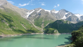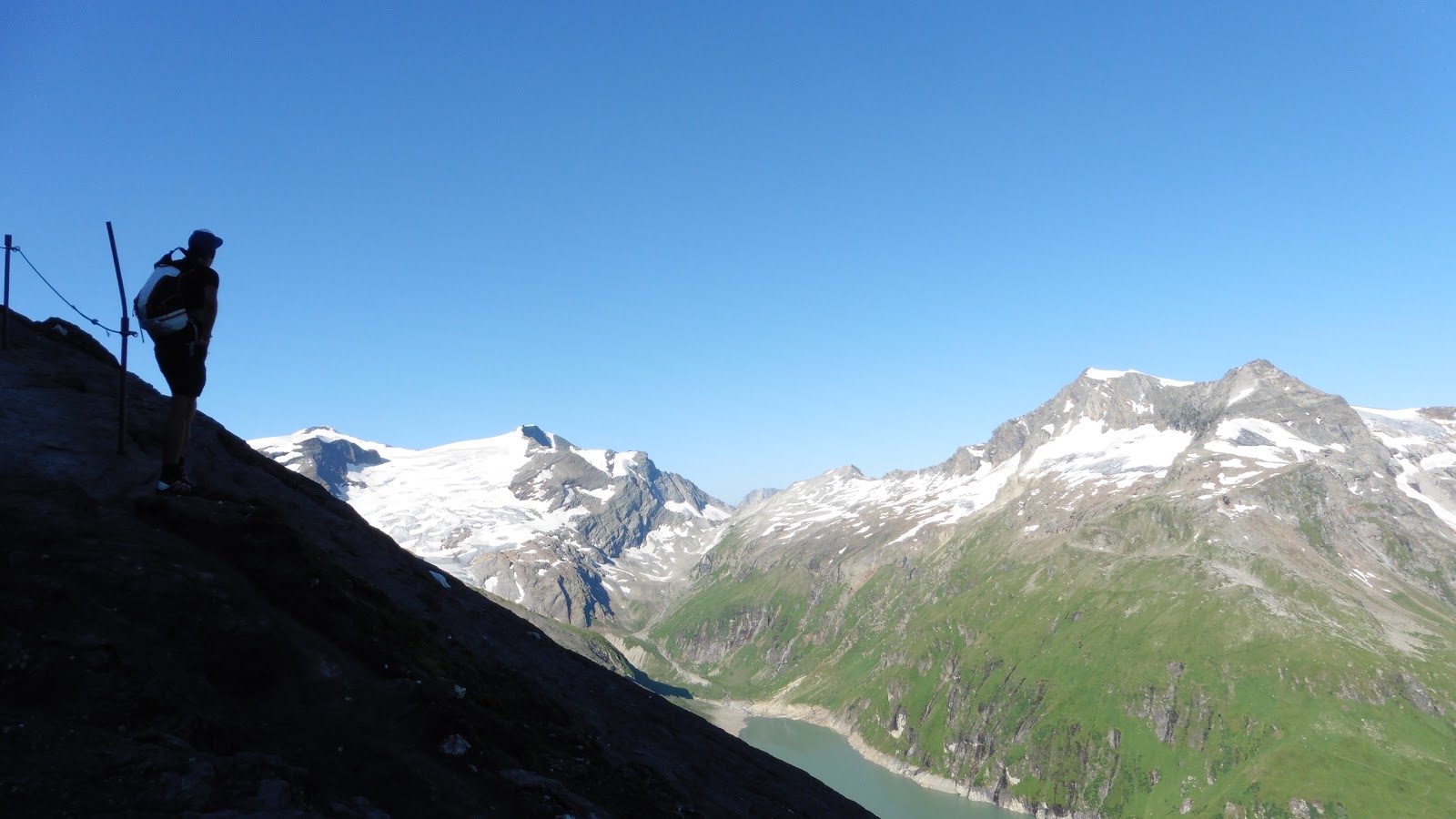 Zurück zum Mooserboden wird wieder der Turbo gezündet, denn die Gewitterwolken bäumen sich schon mit lauten Drohgebärden über uns auf. Als der Regen einsetzt, sitzen wir bereits im Restaurant und machen uns mit Kaffee fit für den letzten Abstieg Richtung Kesselfall. Ziemlich lukullisch so eine Hochtour, nicht wahr? Diesmal müssen wir an den Tunneln außen vorbei gehen, um die Gefahr von den Bussen überrollt zu werden zu minimieren. Ein teils recht ausgesetzter Steig bringt uns direkt über dem See wieder auf die Straße. Und der Blick zurück, spricht für sich: bello impossibile!