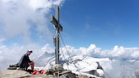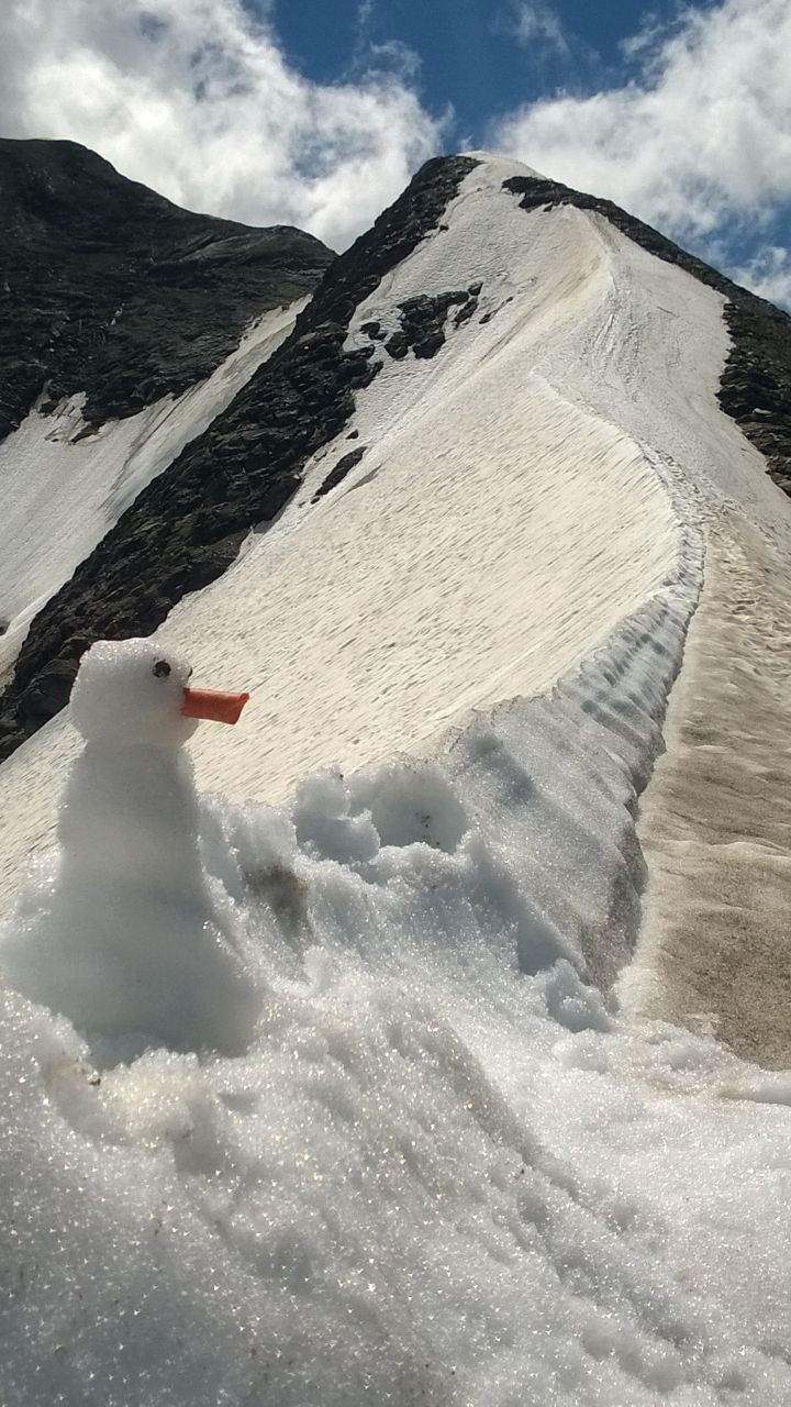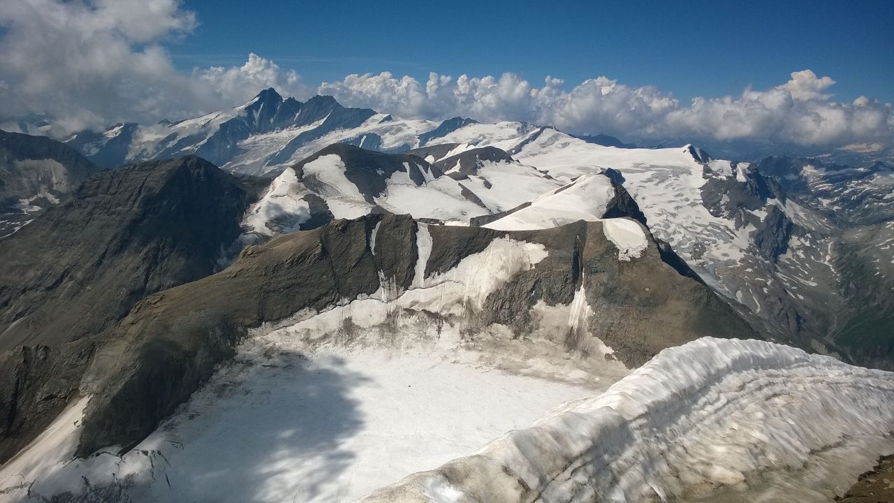 Ein letztes Schneefeld wird umgangen und der Gipfel ist in greifbarer Nähe. "Und, besser kann man nicht Geburtstag feiern, oder?". Hans nickt und lächelt, als würde er für die neue Blendamed-Werbung posieren. Nach langen Stunden der Plackerei ist das 3.564 Meter hohe Horn erreicht. Wir setzen uns und lassen uns von den Wolkenfetzen umspielen. Allgegenwärtig bleibt Österreichs höchster Berg, der von hier gar nicht so einladend aussieht, wie er zu sein scheint. Die ungewollte Einladung auf seinen Gipfel zu steigen, nehmen aber auch heuer wieder tausende Bergsteiger aus aller Welt dankend an. Nur wenige Meter unterhalb können wir im Stillen darüber philosophieren.