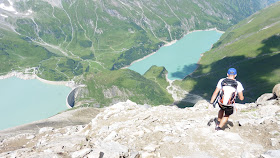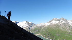 Alter schützt vor Torheit nicht und so entscheiden wir uns die gerade Linie durch die Tunnel zu nehmen. Einige Kilometer marschieren wir unter Tag, bevor sich der Weg elegant an der Straße vorbeischlängelt und wir den Mooserboden erspähen können. Hier auf 2.040 Metern ist es noch ruhig, auch die Murmeltiere haben ihr Pfeifkonzert noch nicht begonnen. Einzig ein Bergnomade geistert herum und wartet auf die Öffnung des Restaurants. Von hier aus ist bereits das Dach des Heinrich-Schwaiger-Hauses zu erkennen und wir wissen, dass noch einmal harte 800 Höhenmeter auf uns warten, bis sich das Koffein endlich seinen Weg ins Blut bahnen kann. Der Weg zur Hütte ist fein angelegt, Seilversicherungen erleichtern den teils steilen Anstieg und der nahe Stausee könnte schöner nicht sein. Die ersten ungläubigen Blicke entgegenkommender Wanderer treffen mein Schuhwerk. Mit den Winterlaufschuhen bin ich in dieser Höhe wohl etwas "underdressed". Mein Mut, oder war es doch Übermut, sollte sich aber bezahlt machen.
