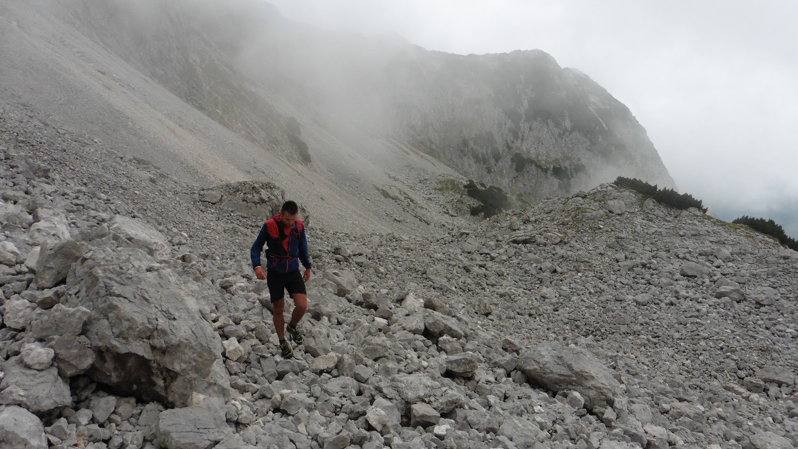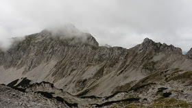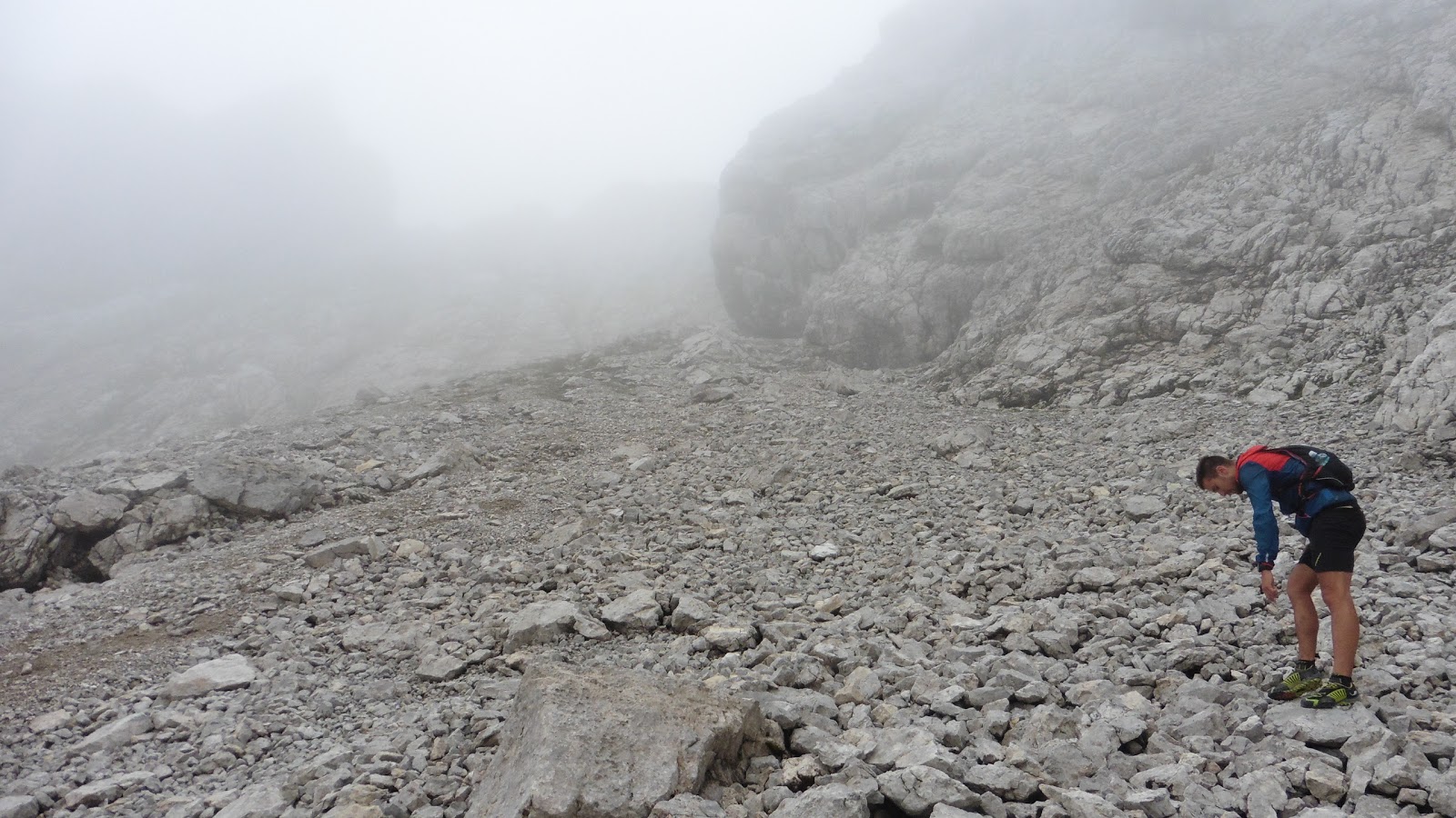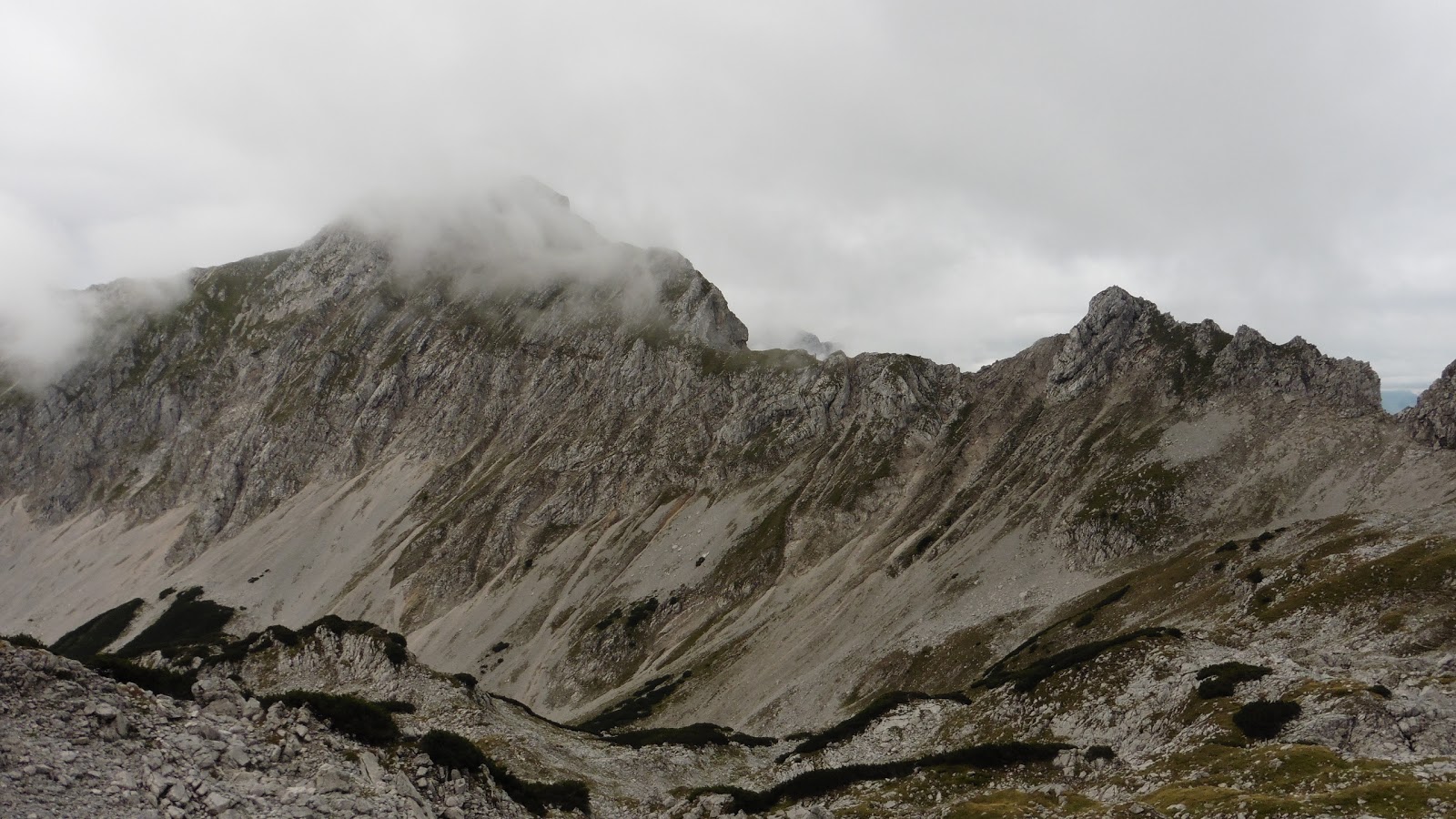 Kurz in brüchigen Erinnerungen geschwelgt, schieße ich auch schon wieder den Weg hinab, um Hans nicht zu lange in den Wolken warten zu lassen. Die haben sich mittlerweile vom Himmel auf den Wanderweg begeben und sorgen für eine ordentlich mystische Stimmung. Erst wenn sich der Weg steil nach rechts zieht und das schutterfüllte Laglkar ins Blickfeld rückt, verlässt man die Markierungen und kann mit dem zweiten Außenseiter auf Tuchfühlung gehen. Der Mitterberg ist ein steiler Zapfen und lässt nicht nur Freunde der weglosen Abenteuer, sondern auch Kletterer auf ihre Kosten kommen. Der eingebohrte Nordgrat (III+) besticht aber vor allem durch seine Brüchigkeit.