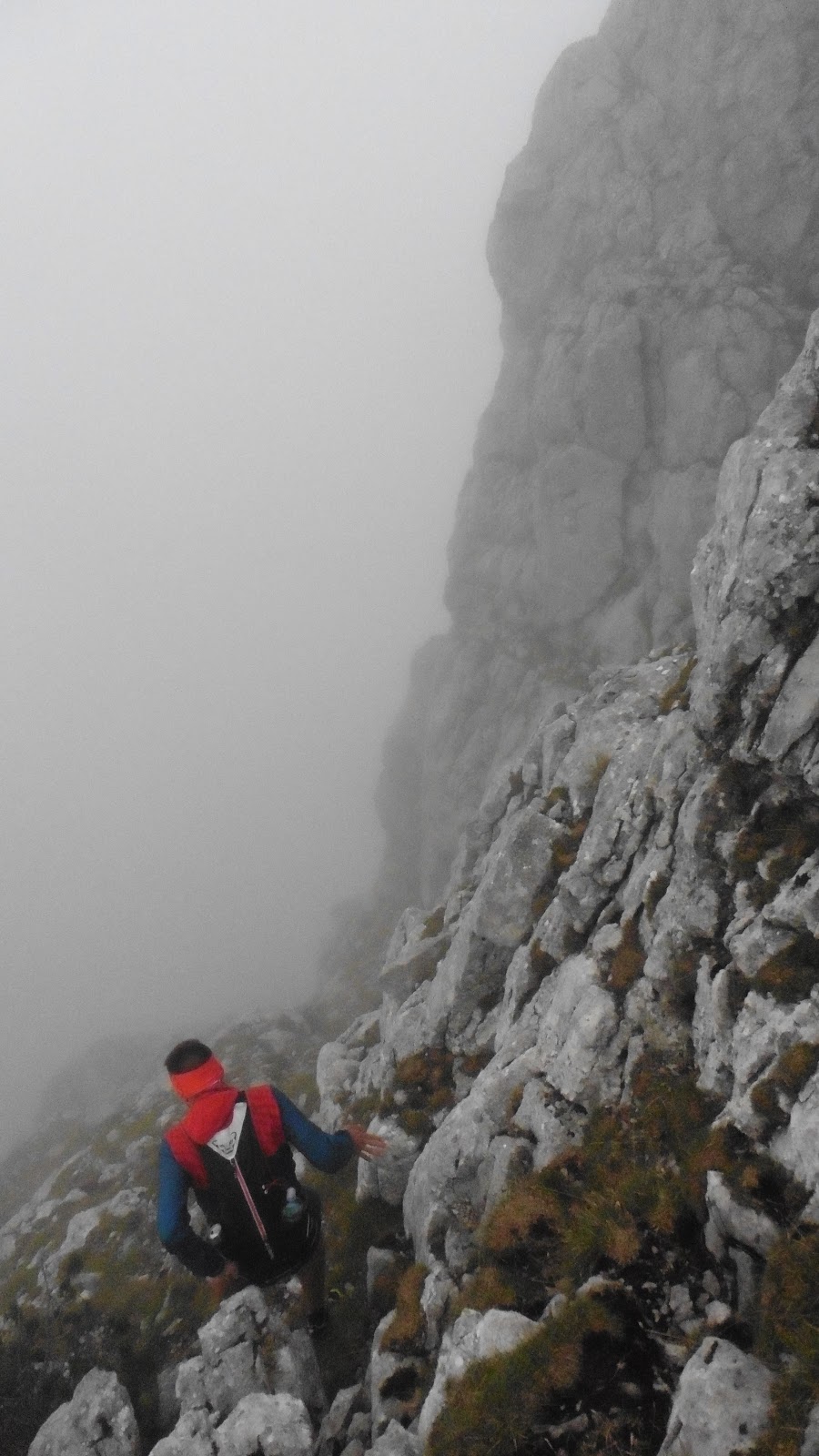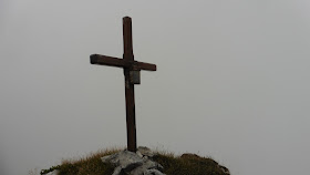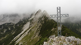 Am Gipfel angekommen, türmen sich die Wolken ringsherum auf den schroffen Wänden. "Halt, nicht zu fest an die Felsen drücken, da fliegt sonst was" denke ich. Die Haller Mauern sind nämlich berühmt-berüchtigt für ihr außergewöhnlich brüchiges Gestein. Im Zuge