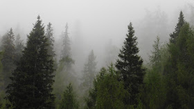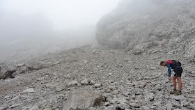 | Dort, wo der Nebel dicht wird, geht es die Rinne hinauf |
