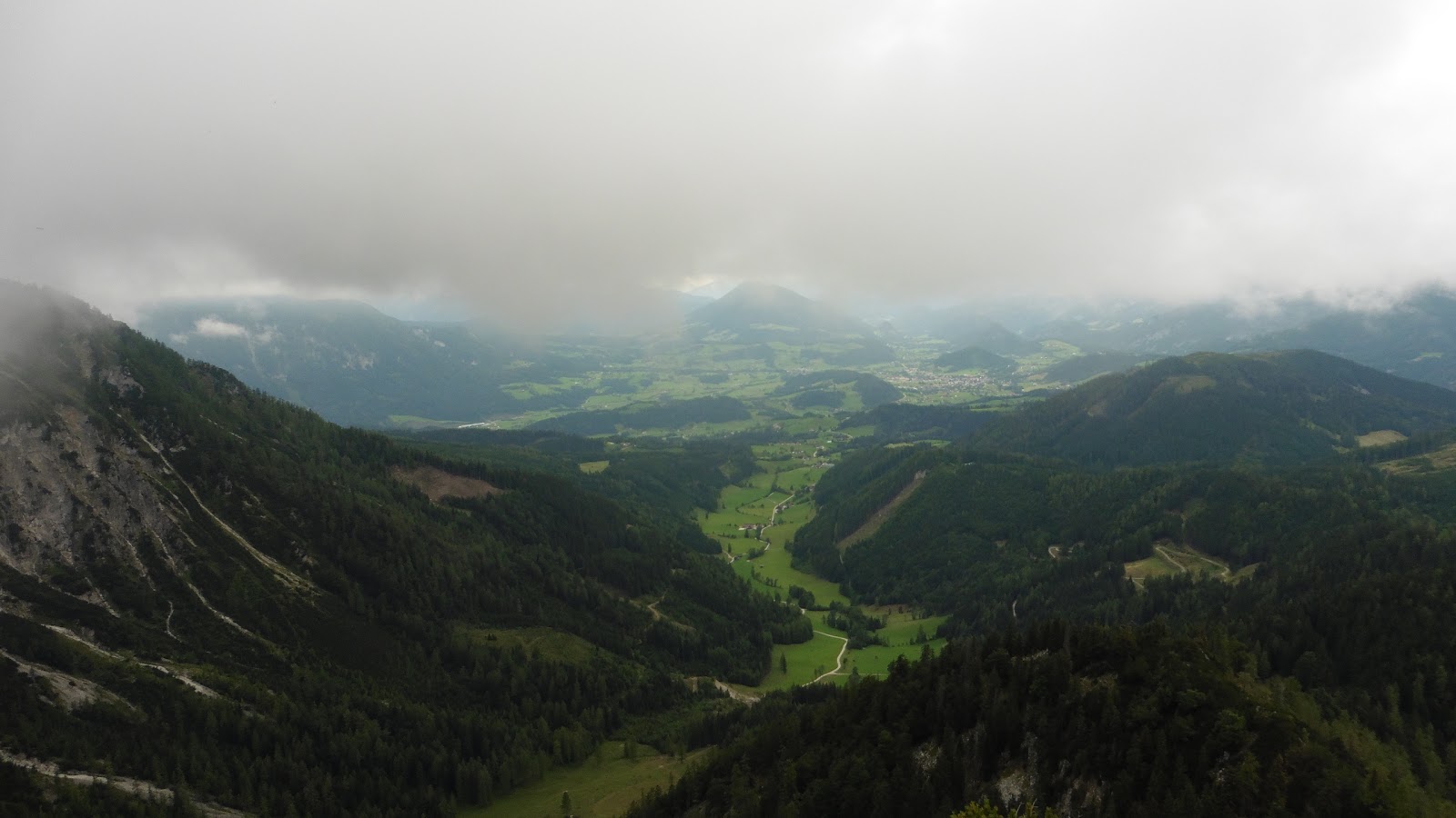 Weil sich die Tropfen langsam aber sicher zu einem ausgewachsenen Regenguss entwickeln und die Aussicht auch mit langem Anstarren einer weißen Wand von zu Hause aus genossen werden kann, verabschieden wir uns vom Mitterberg. Die Nässe kriecht uns in die Kleidung und auch die Rinne ist nicht mehr ganz so elegant zu bewerkstelligen.