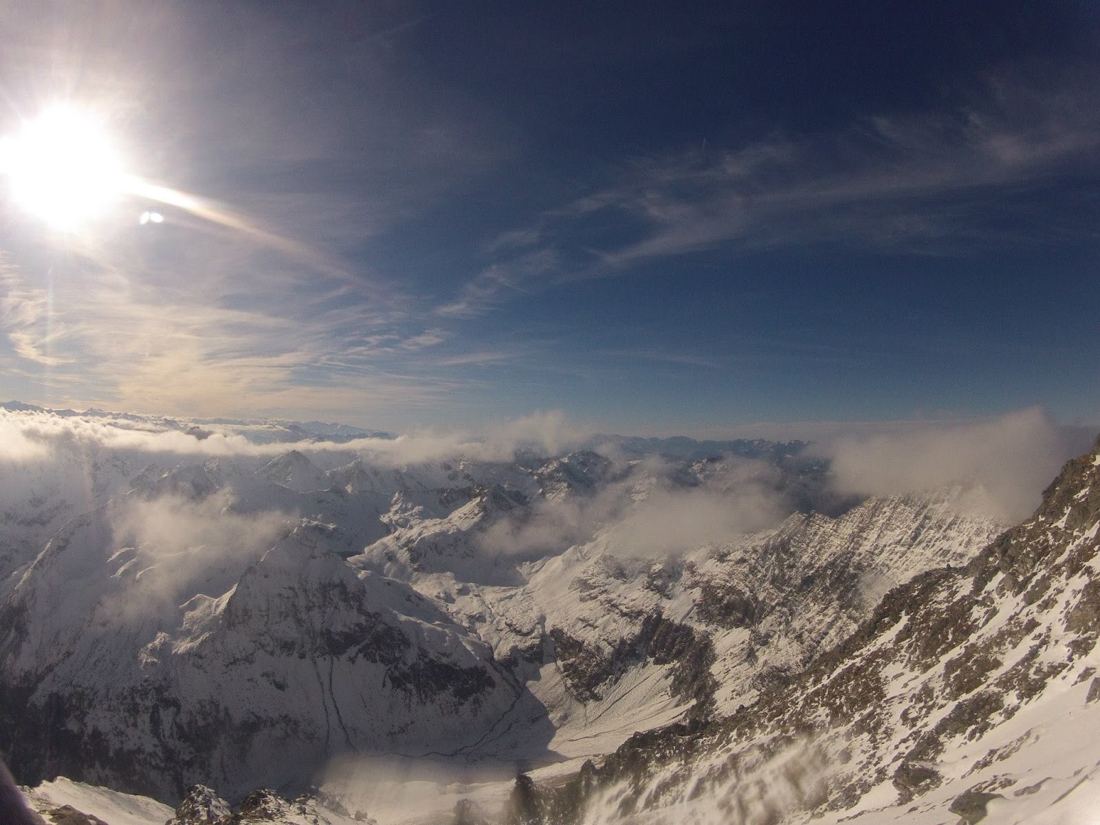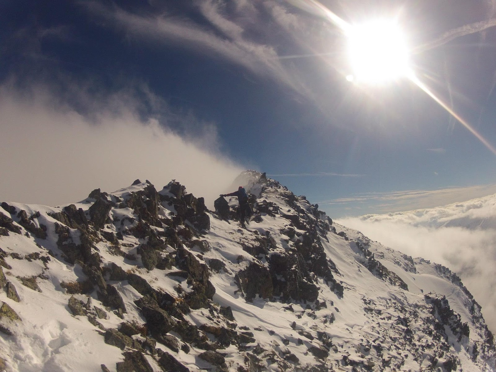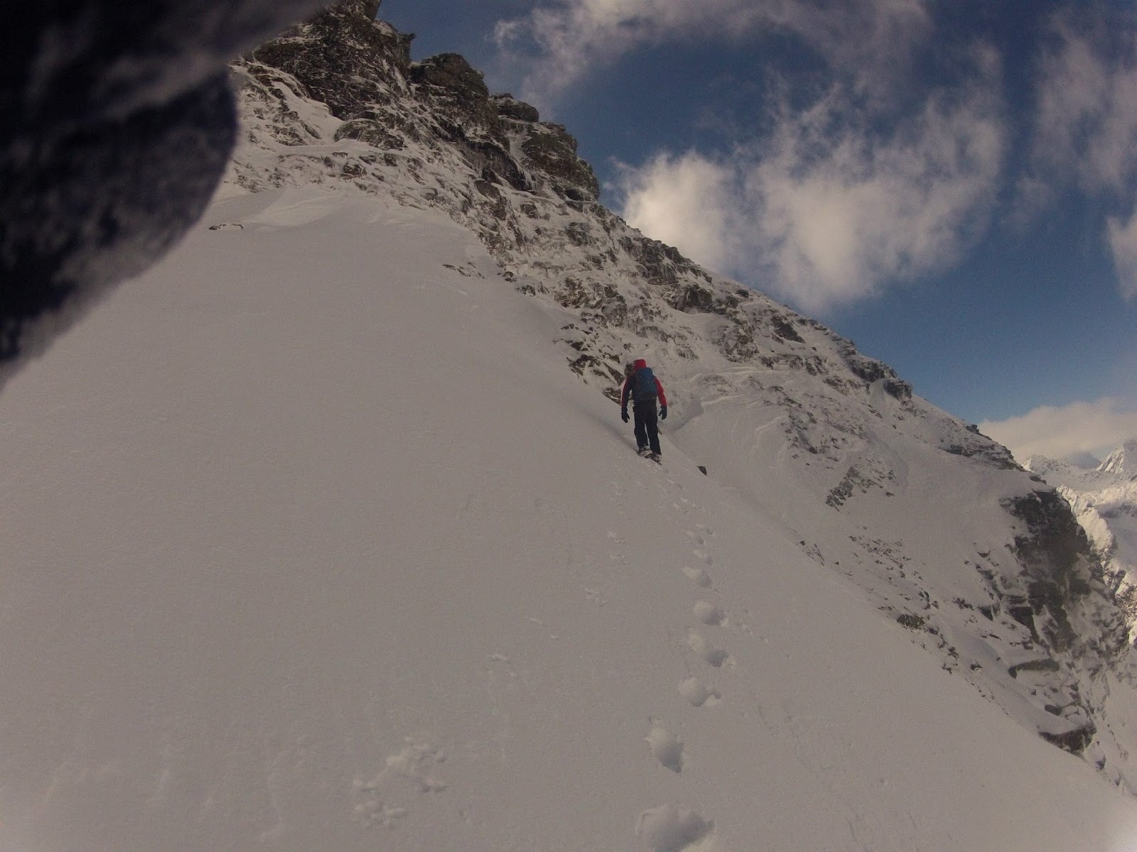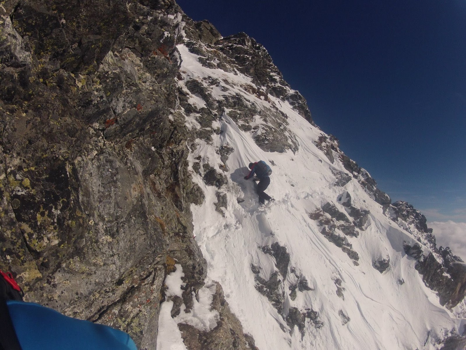 "Schau mich nicht so an, die Entscheidung hast du doch längst gefällt" sagt Matthias und verzieht seine Mundwinkel zum ersten Schmunzeln seit wir uns auf der Hinfahrt über den letzten Umtrunk unterhalten haben. Wir wenden uns nach links und klettern einige einfache Stellen nach oben, bevor uns der Anblick fast erschlägt. Eine Gratschneide aus den Westalpen liegt vor uns, der Wind lässt die Schneekristalle im Sonnenlicht tänzeln, die Wolken drücken gegen den Gipfelaufbau und alle Anspannung ist für wenige Sekunden vergessen.