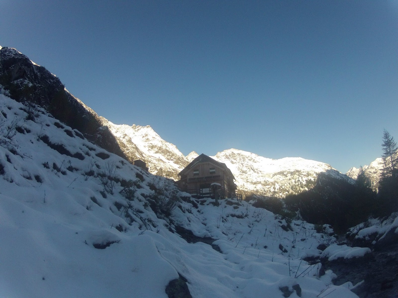 Die geschlossene Gollinghütte ist erreicht. Hier ist es schon richtig winterlich und langsam bekommen wir doch ein unangenehmes Gefühl in der Magengegend. Auf 1.641 Metern umdrehen, das können wir aber auch noch nicht. "Schauen wir mal" wird zur antwortenden Phrase auf alle sich stellenden Fragen auserwählt.