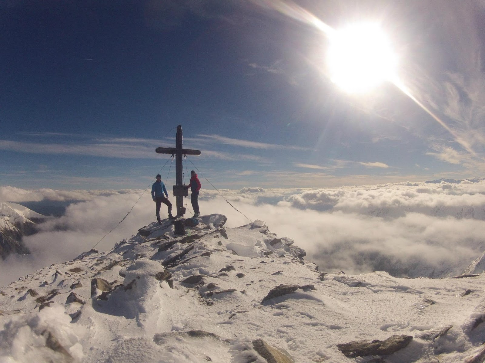 Wir können den Gipfel schon sehen, bis dorthin ist es nur mehr Gehgelände. Die Last fällt nicht ab. Die Nervosität bleibt konstant hoch. Der höchste Punkt ist erreicht, das hölzerne Kreuz ist gezeichnet vom frühen Winter. Das arme Ding scheint nicht vorbereitet gewesen zu sein, ganz so wie wir. Nur wir hätten es besser wissen müssen, auch mit einem Holzkopf.