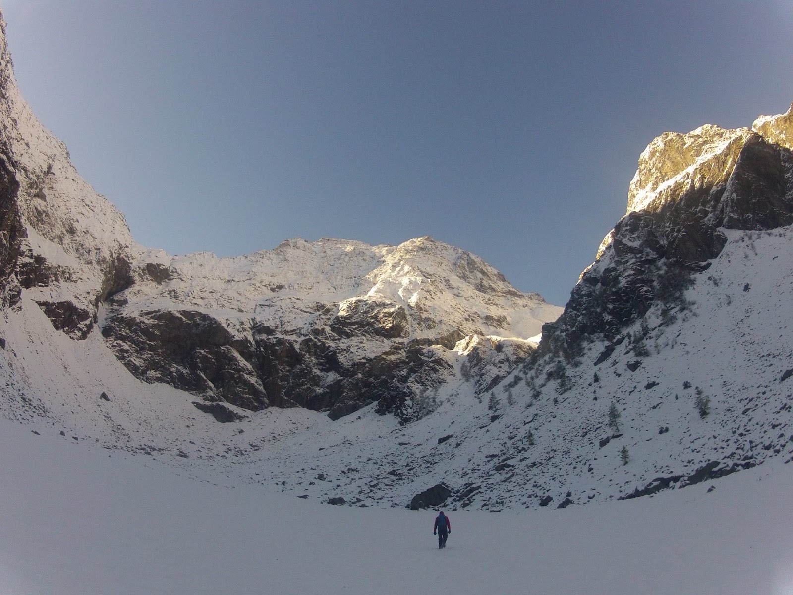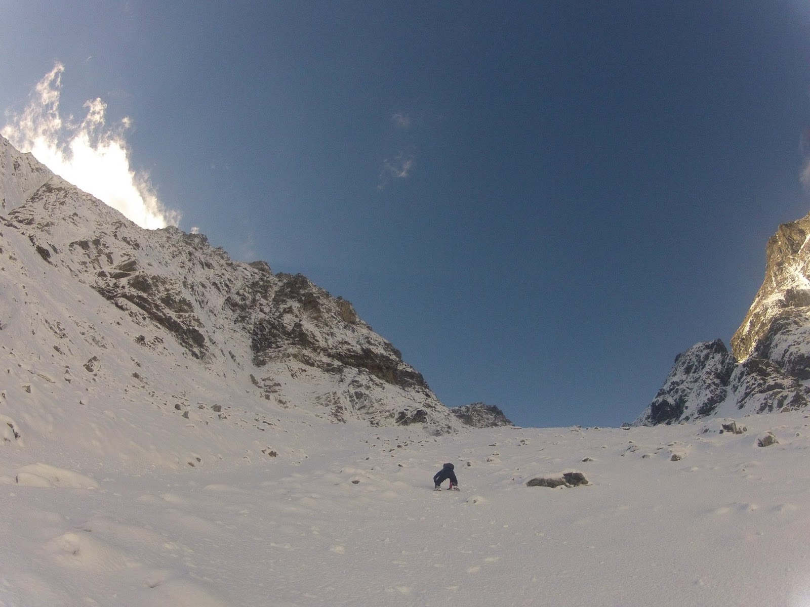 Der Weg in das hinterste Eck des Gollingwinkels ist von ständigem Rauschen begleitet. Unter der geschlossenen Schneedecke fließt ein Bach, erinnert daran, dass eigentlich noch der Herbst das Sagen hätte. Der wurde aber mundtot gemacht- und wie. Die Nordwand des Hochgollings taucht auf und sofort verknüpfe ich sie mit dem Himalaya und einem der größeren Berge dieser Gebirgskette, dem Manaslu. Ich habe bis heute nicht nachgesehen, ob die beiden Berge nur ansatzweise eine Ähnlichkeit aufweisen- diese Illusion möchte ich mir bewahren. Nun steht endgültig fest, dass die Unternehmung auf Messers Schneide steht.