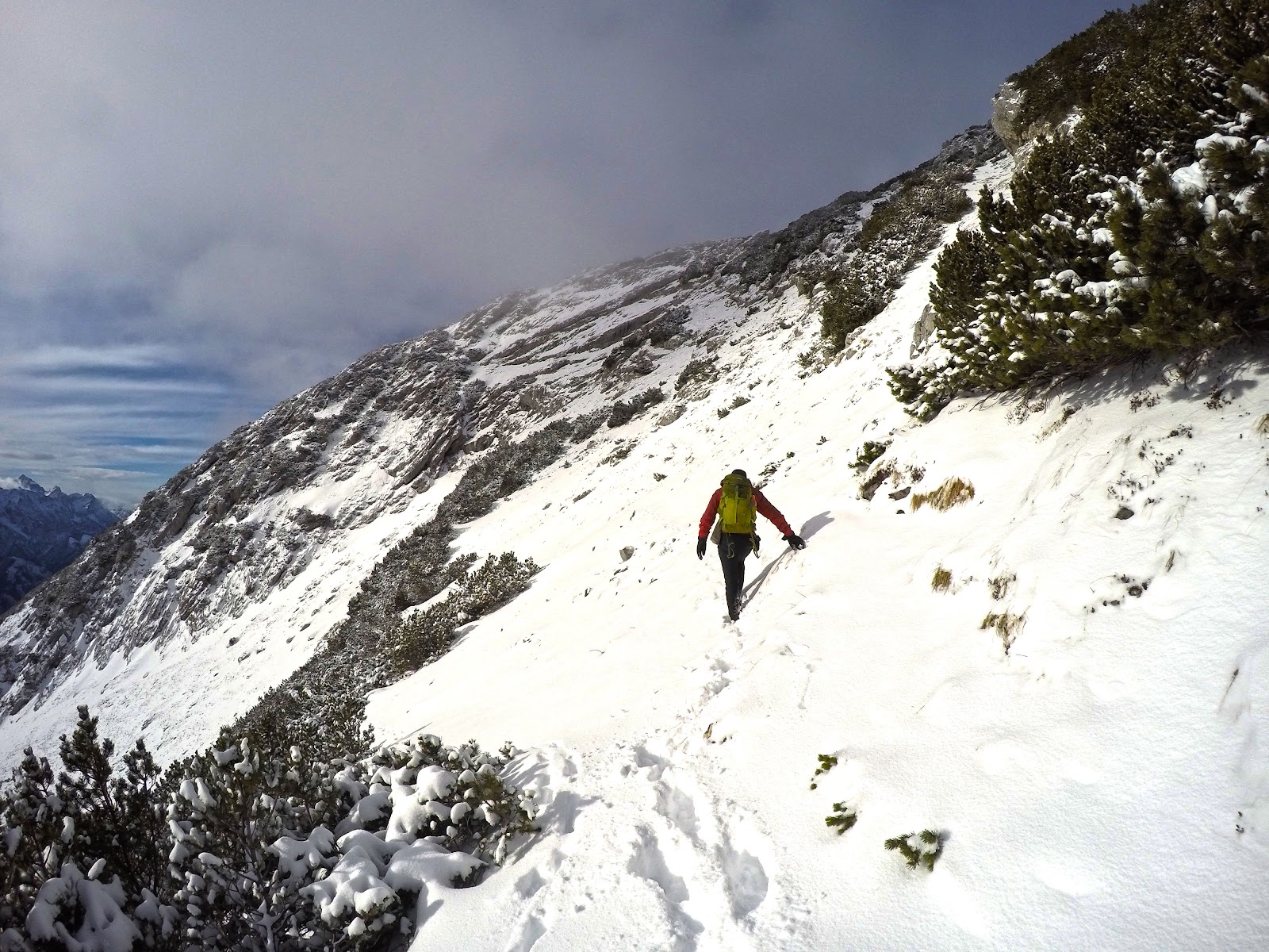 Die steilen Querungen zum Hochsengs sind von lockerem Pulverschnee bedeckt und wirken äußerst ungustiös. Hans lässt sich zu ein paar Metern hinreißen, während ich mit meinem neuen Spielzeug, der GoPro Hero4, auf Tuchfühlung gehe. Ich liebe es, das Kind im Mann.