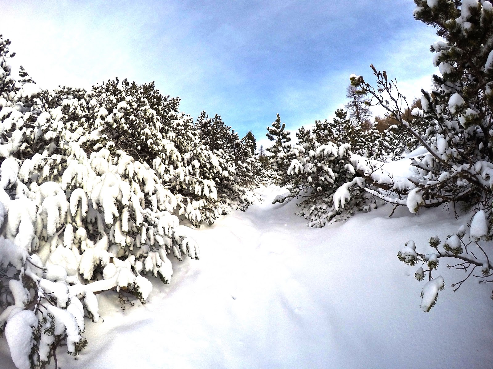 Wir beäugen noch kurz das neue Holzkreuz, bevor wir auf selbem Weg wieder zurück ins Tal galoppieren. Galoppieren nicht ganz, dafür aber flotten Schrittes mit kurzen Ausflügen unter die Schneedecke.